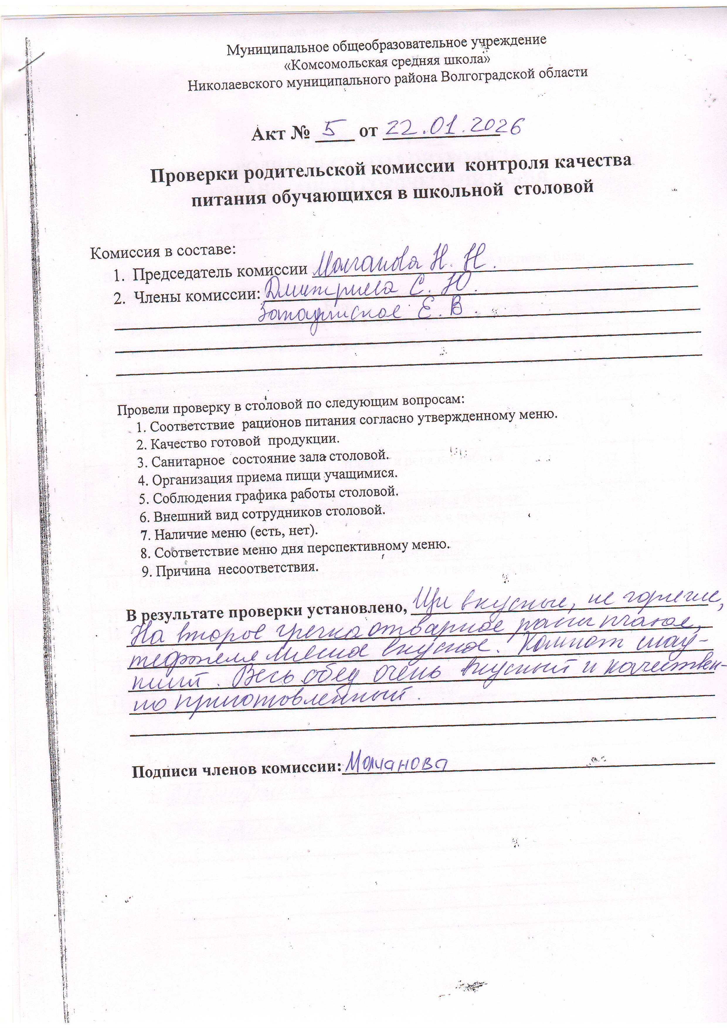 Акт№ 5 от 22.01.2026 родительского контроля за организацией горячего питания