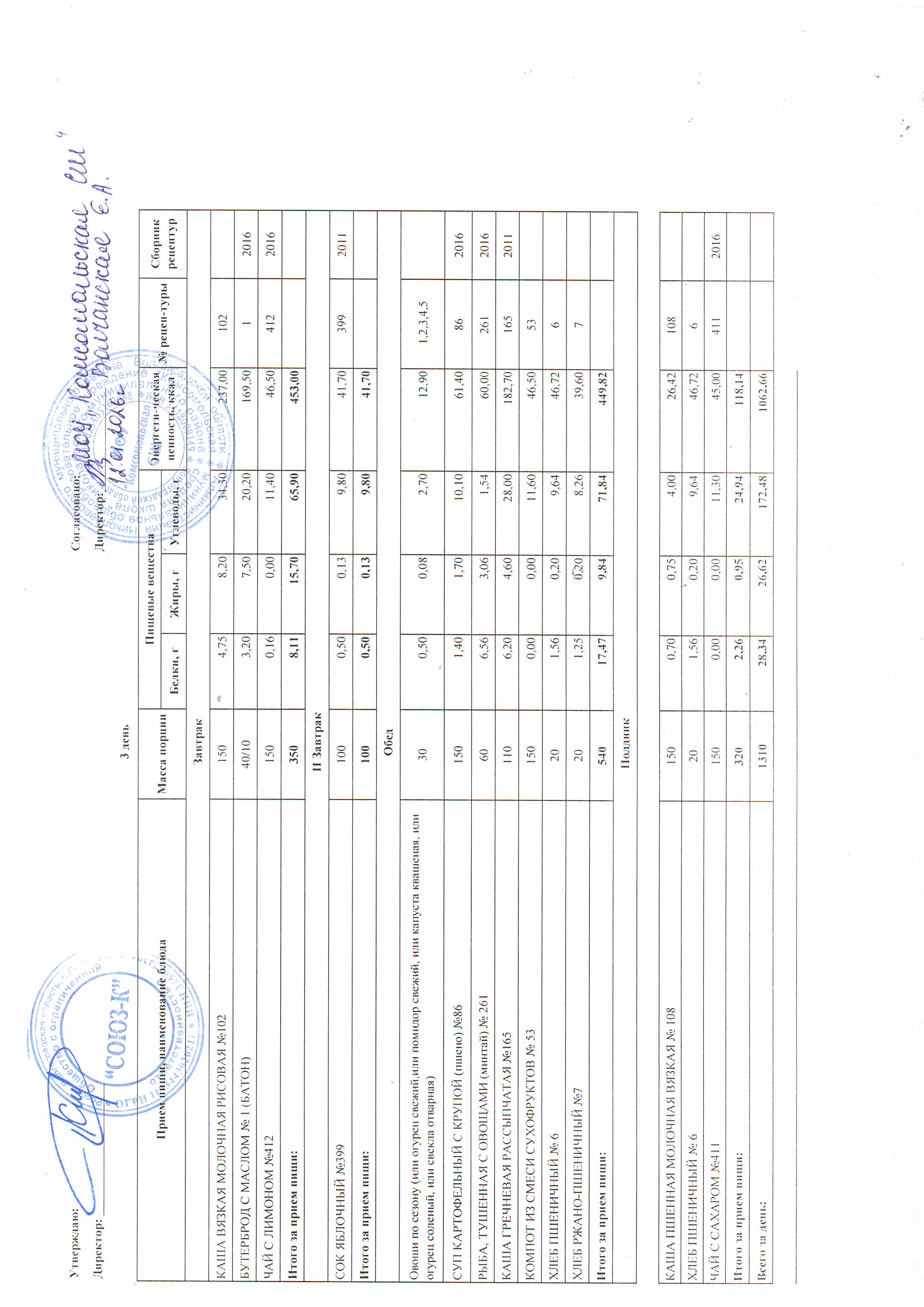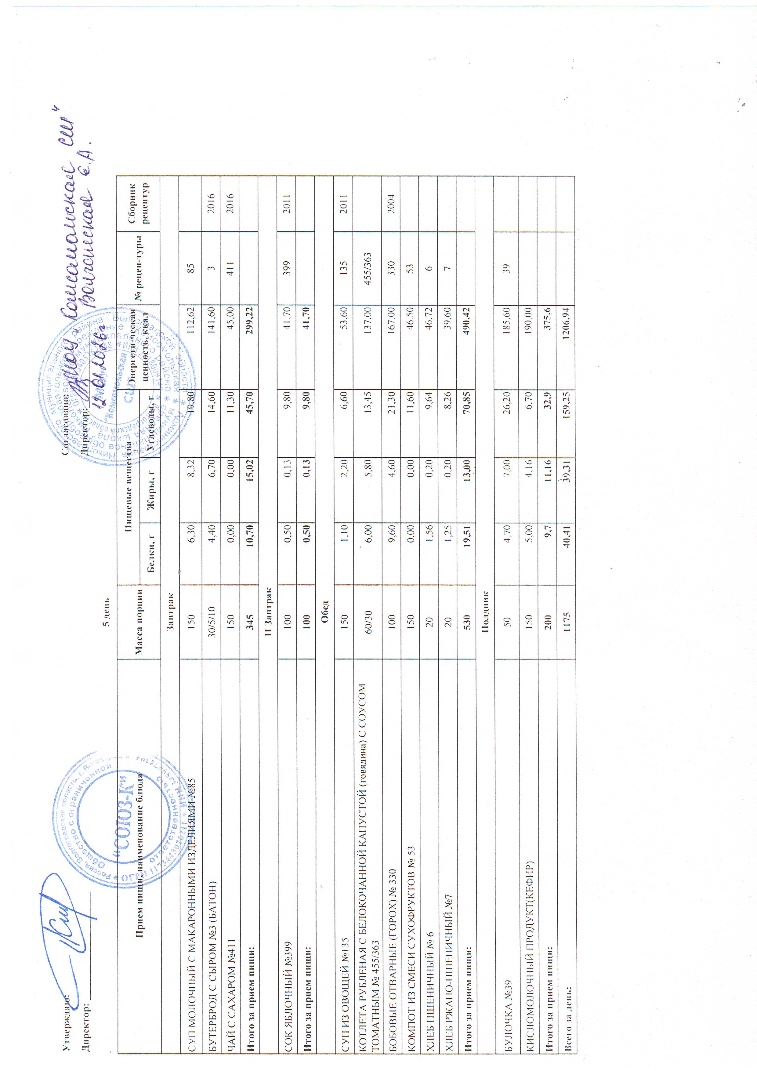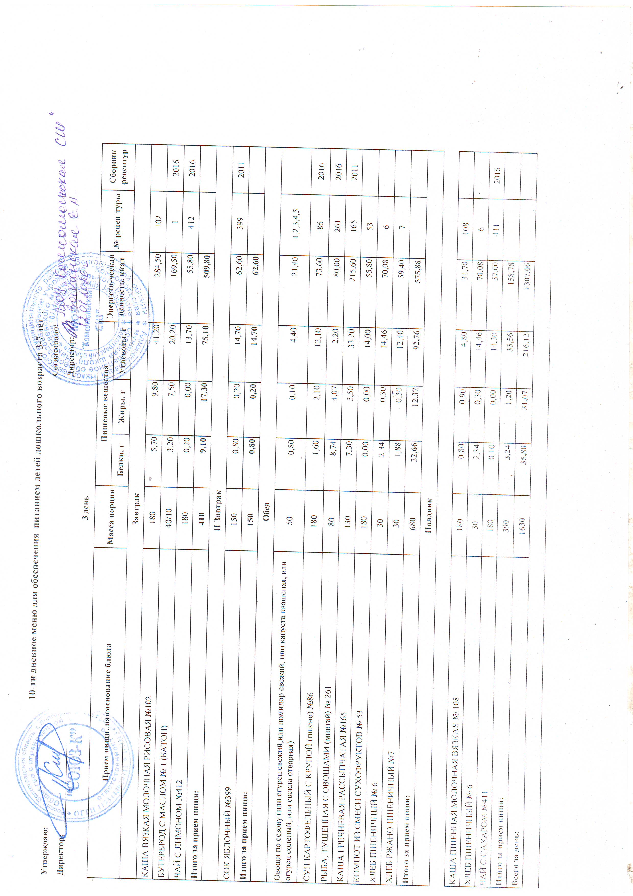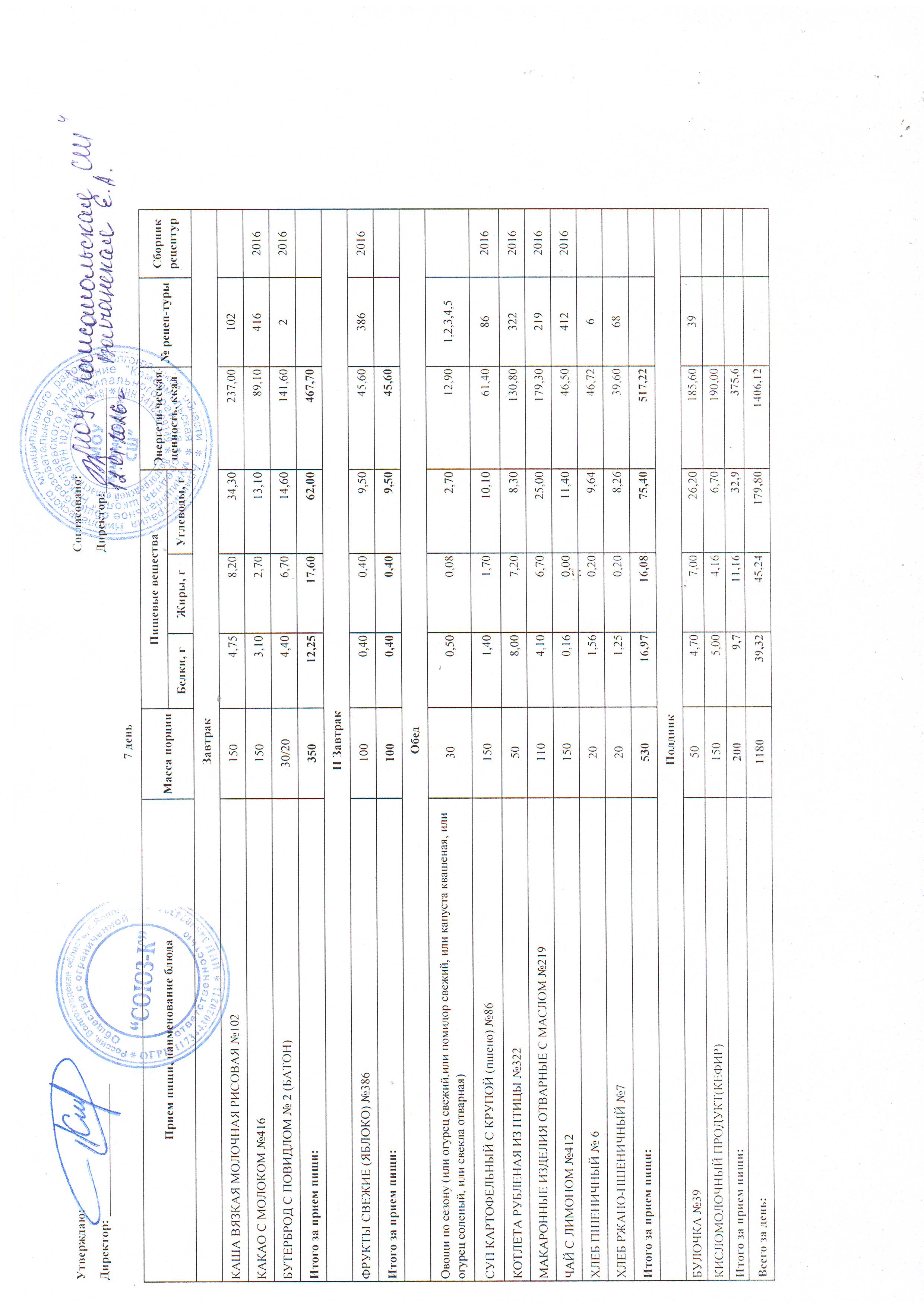 МОУ "Комсомольская СШ" дошкольная группа работает по десятидневному меню, утвержденному директором ООО "Союз - К", согласовано директором МОУ "Комсомольская СШ" Е.А Волчанской.