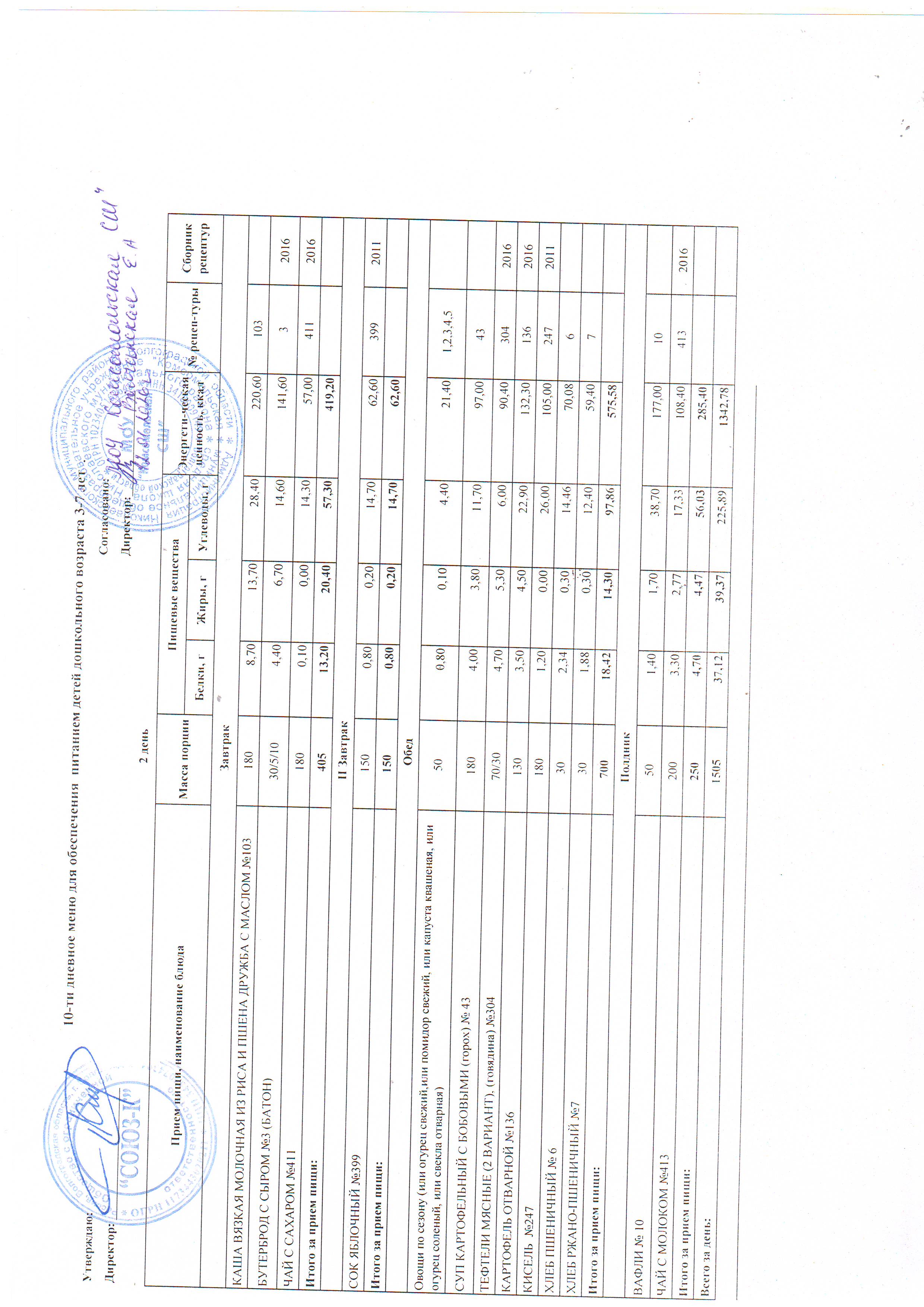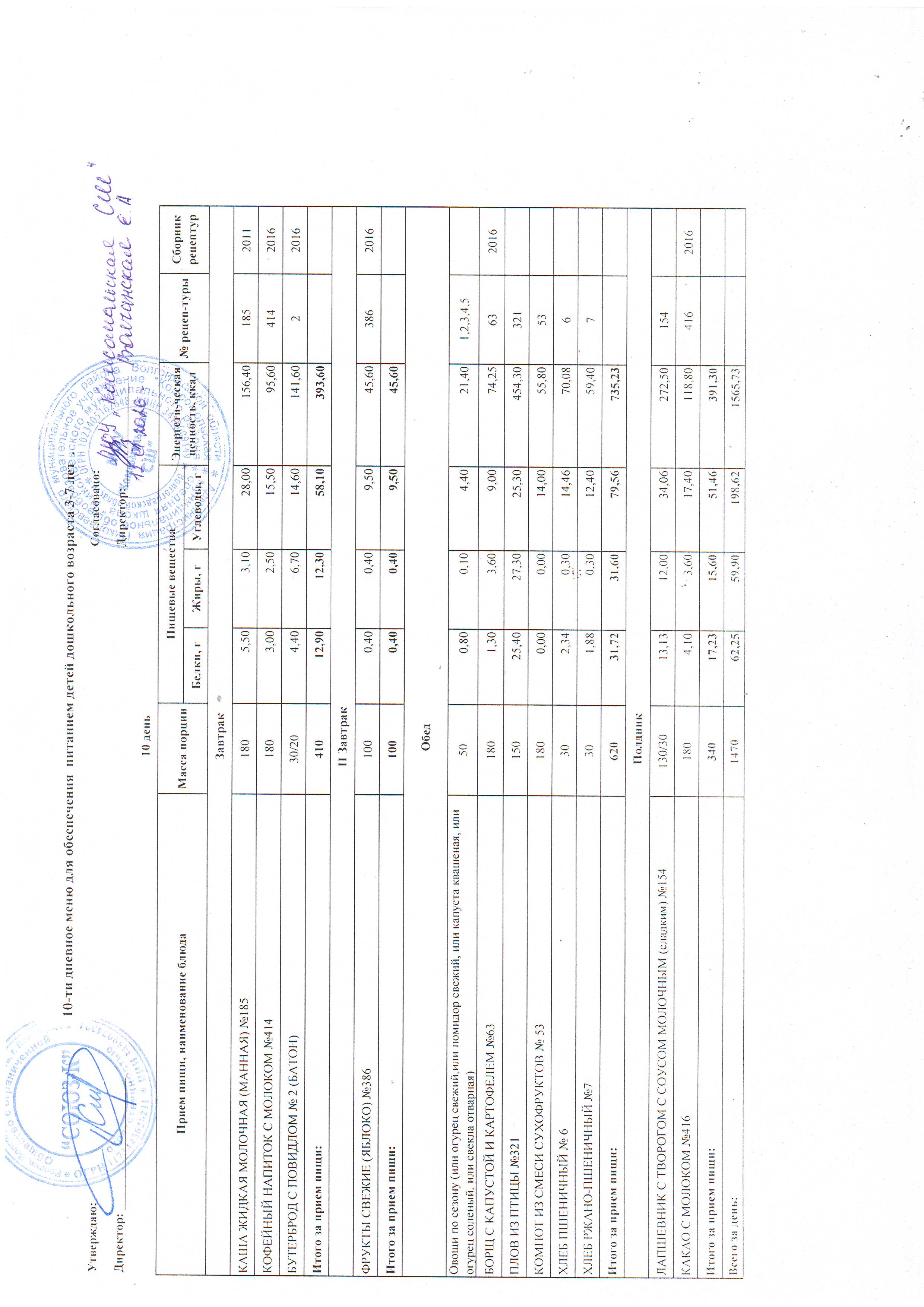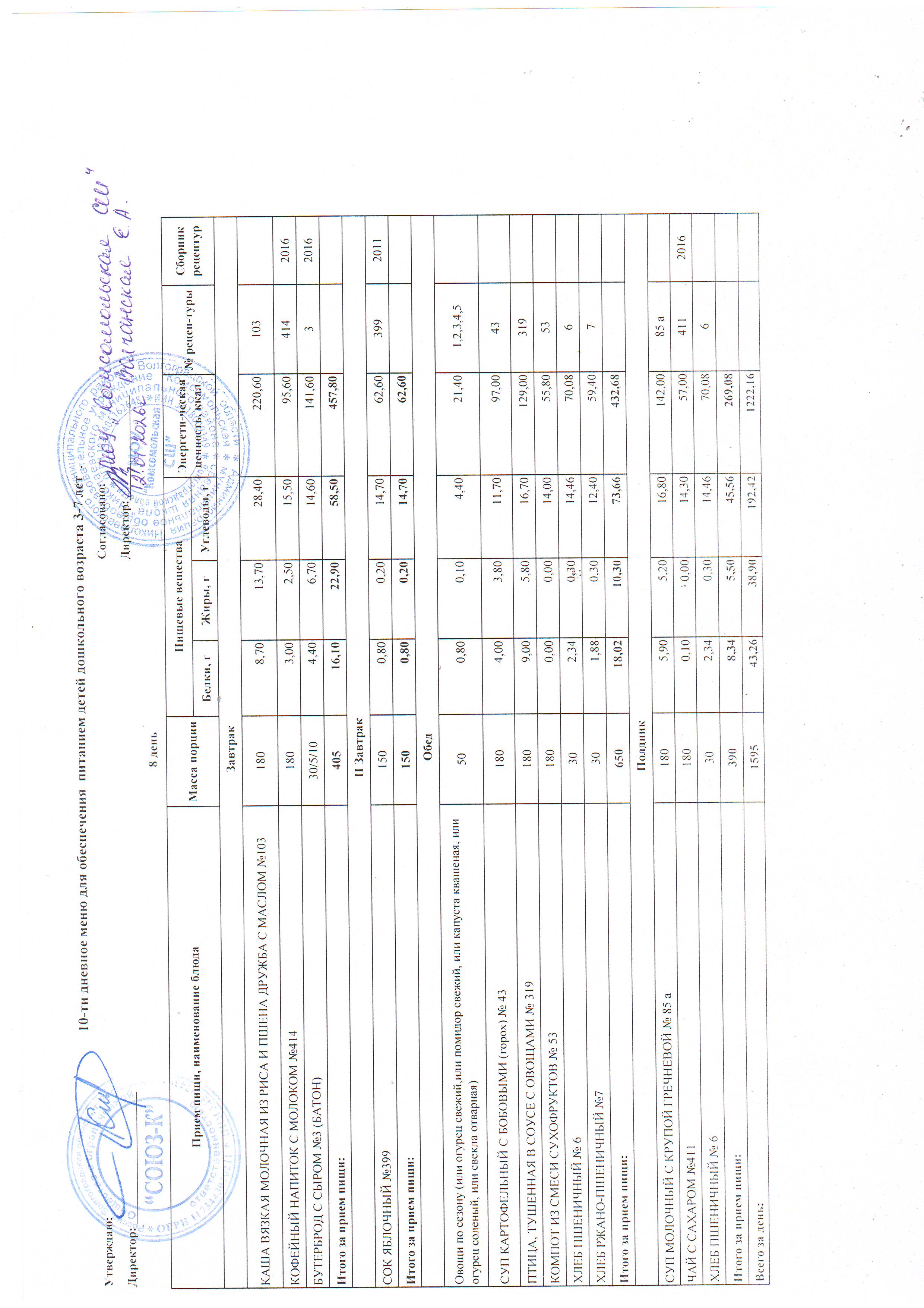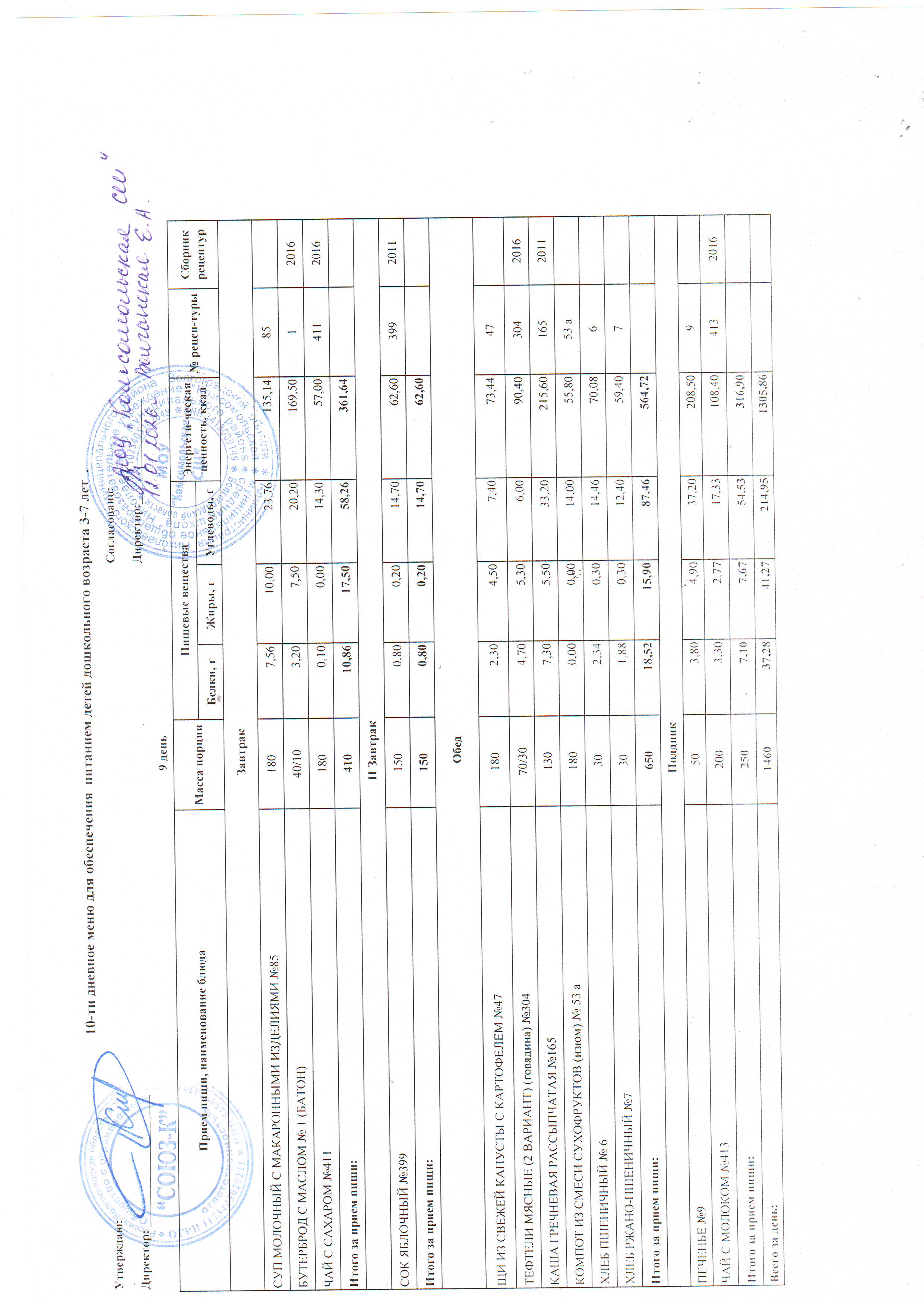 МОУ "Комсомольская СШ" дошкольная группа работает по десятидневному меню, утвержденному директором ООО "Союз - К", согласовано директором МОУ "Комсомольская СШ" Е.А Волчанской.