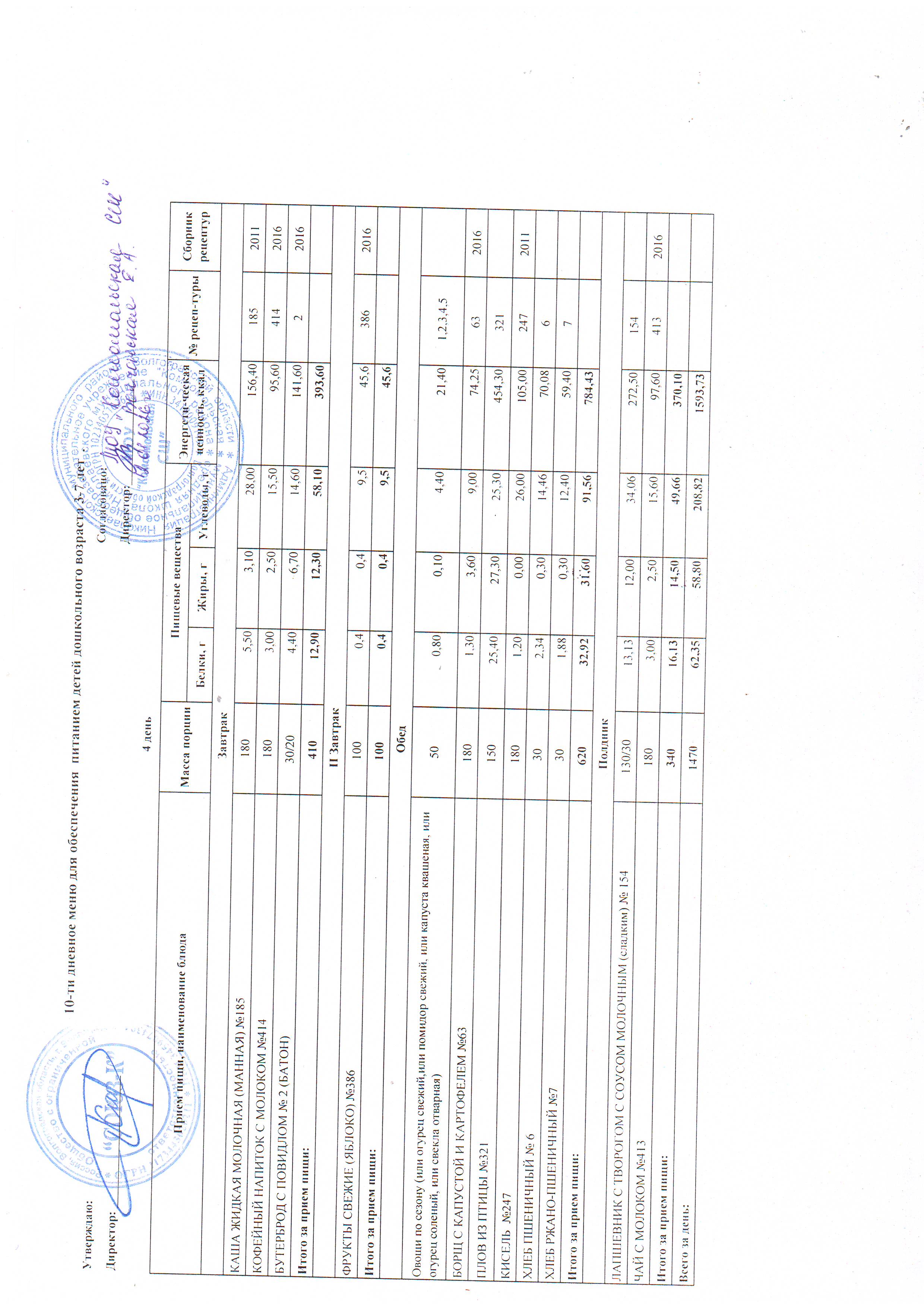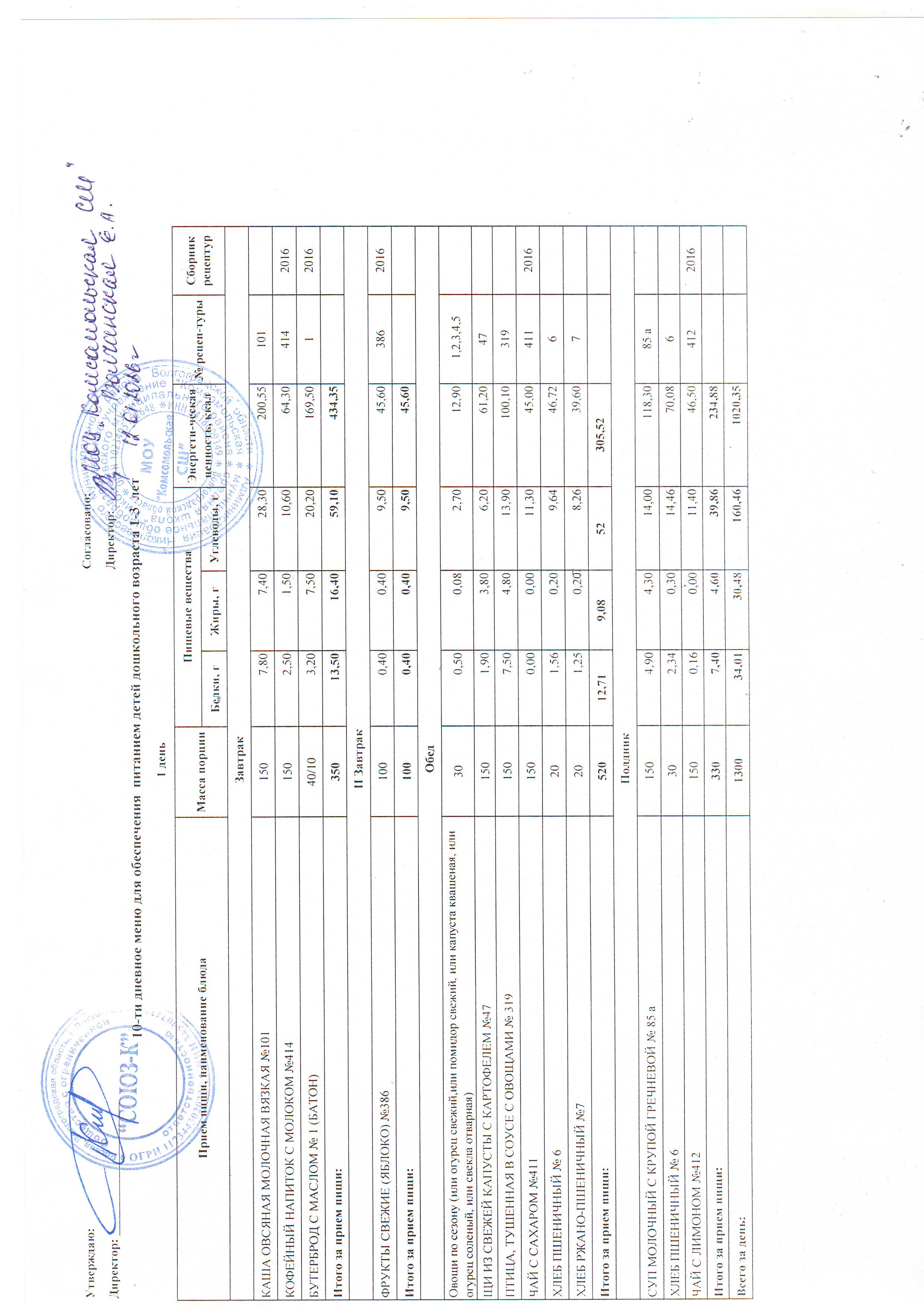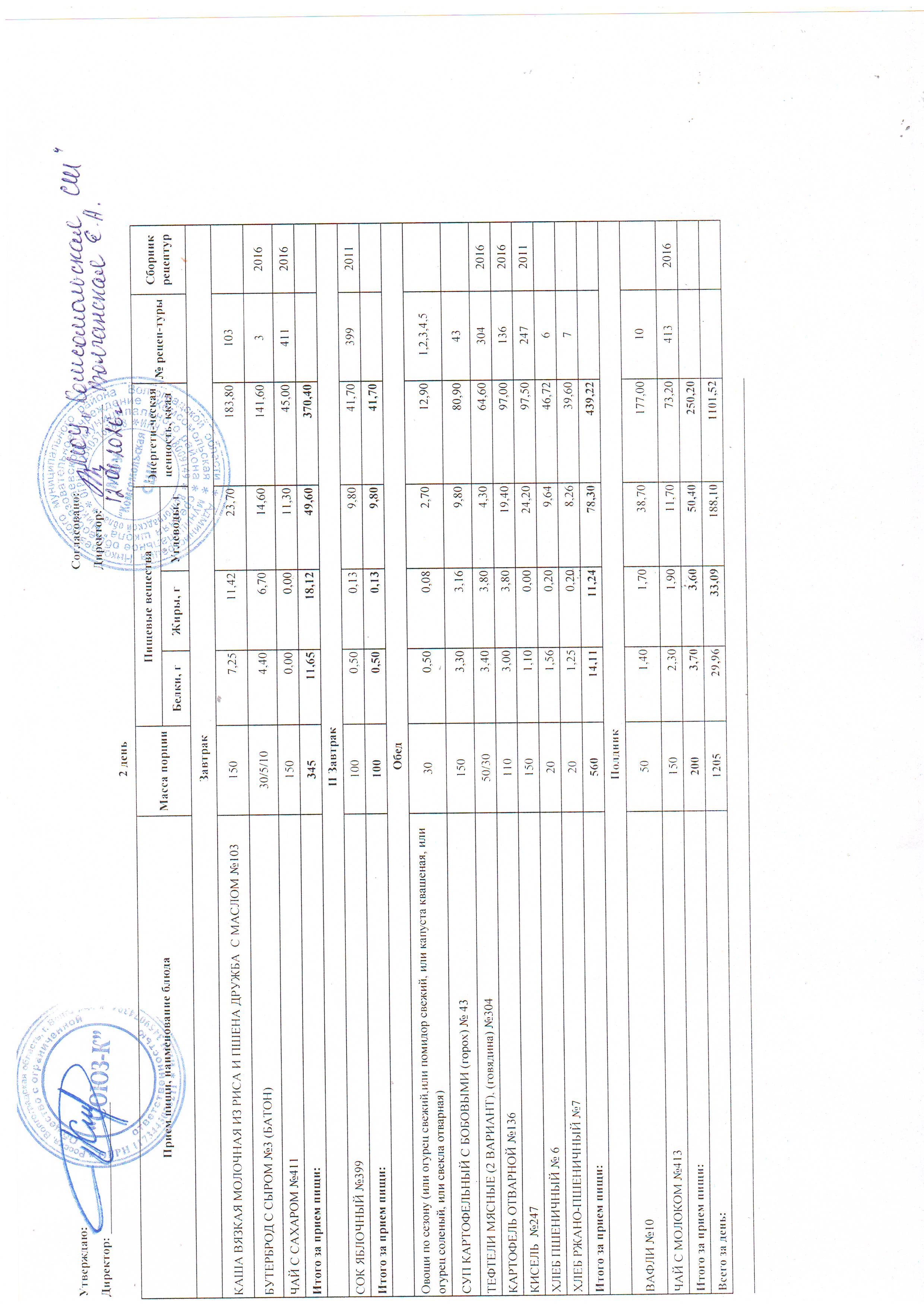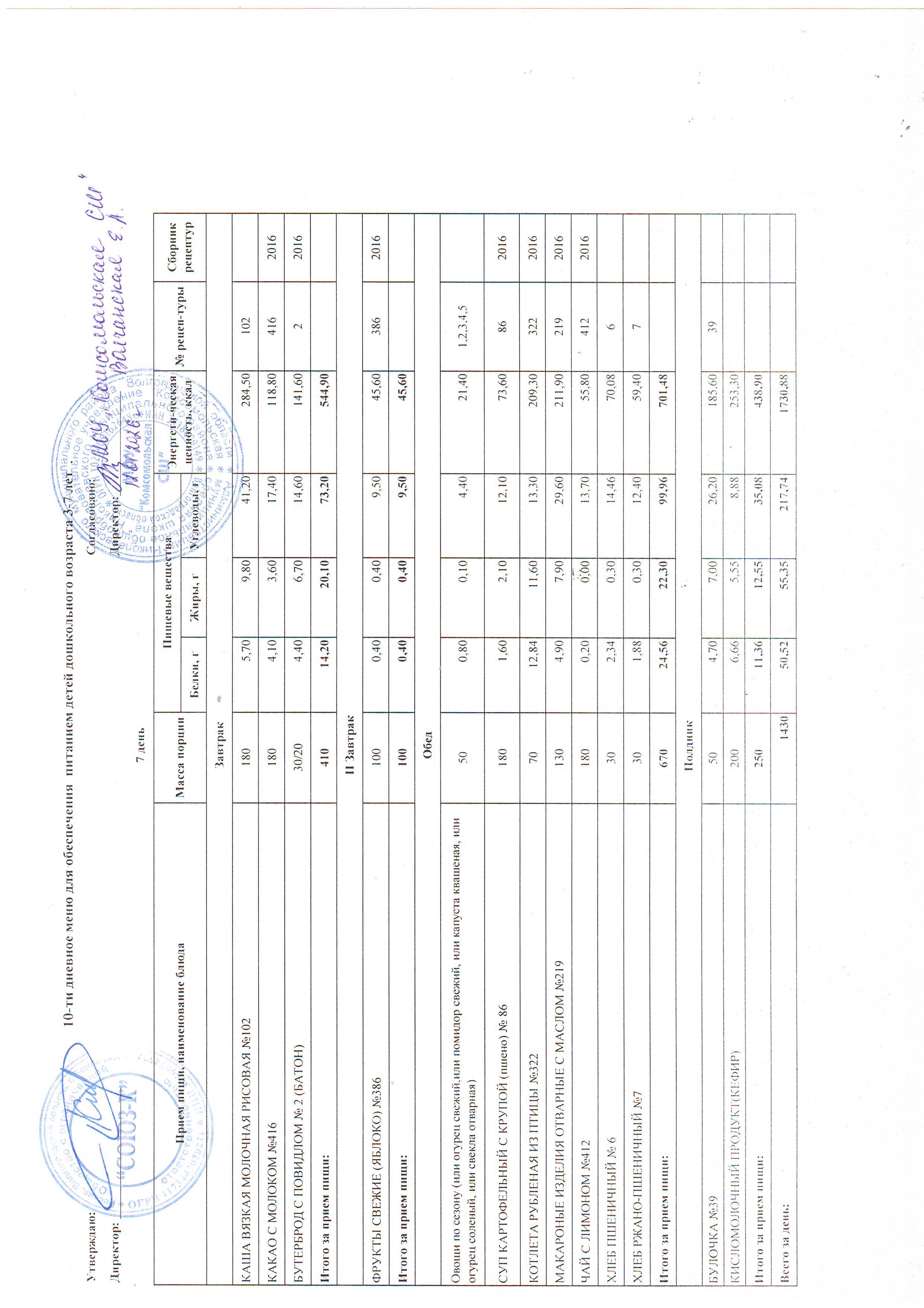 МОУ "Комсомольская СШ" дошкольная группа работает по десятидневному меню, утвержденному директором ООО "Союз - К", согласовано директором МОУ "Комсомольская СШ" Е.А Волчанской.