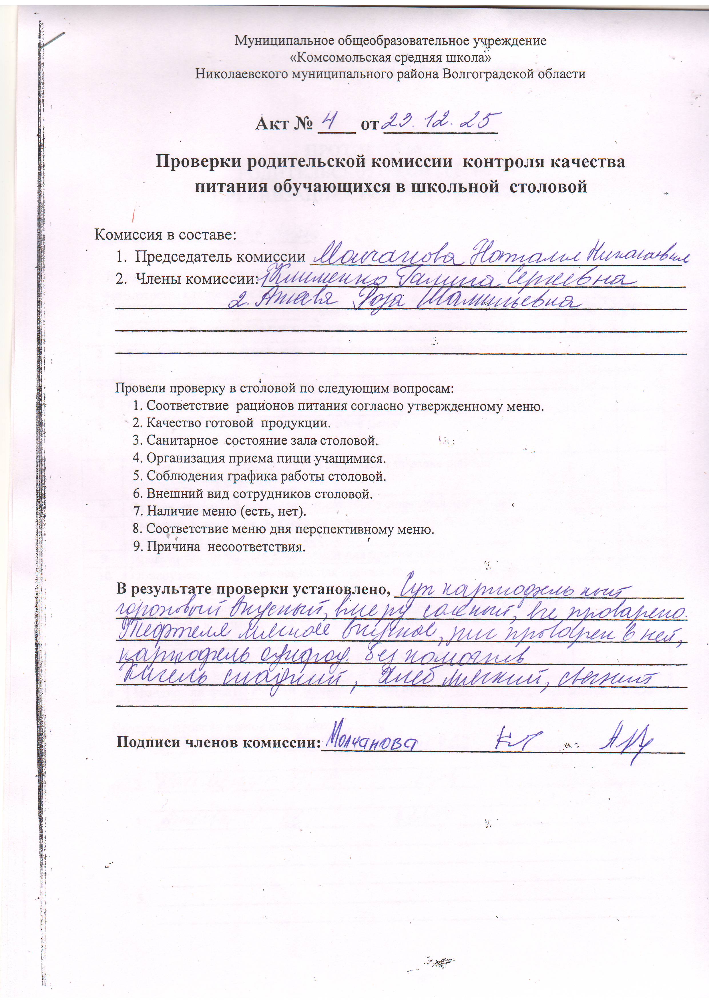 Акт №4 от 23.12.2026 родительского контроля за организацией горя чего питания