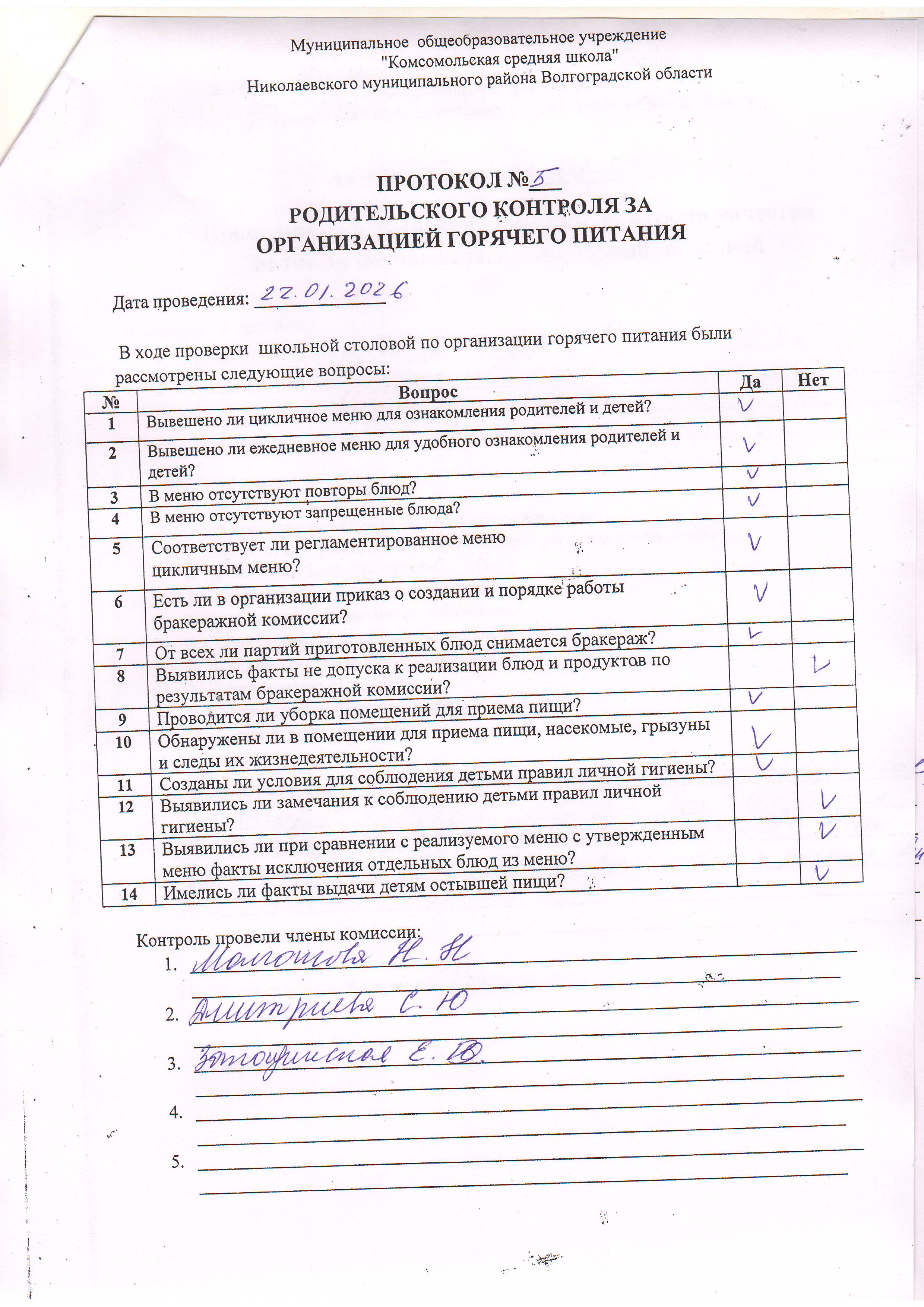 Протокол №5 от22.01.2026 родительского контроля за организацией горячего питания